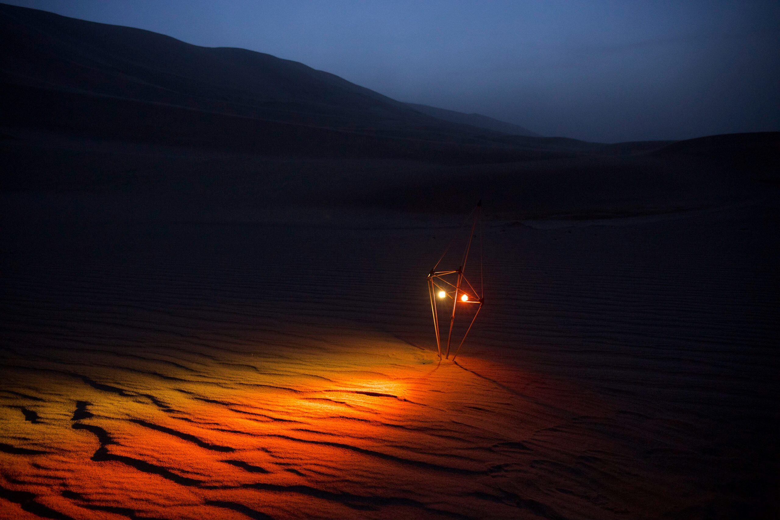 2017Dune Field Modulator is a set of objects that use light as an intervention to change our perception of landscape. The modulator is designed as a nomadic technology that can be carried into the field. As you move through the landscape an ephemeral light-space is created between you, the modulator, and the environment.