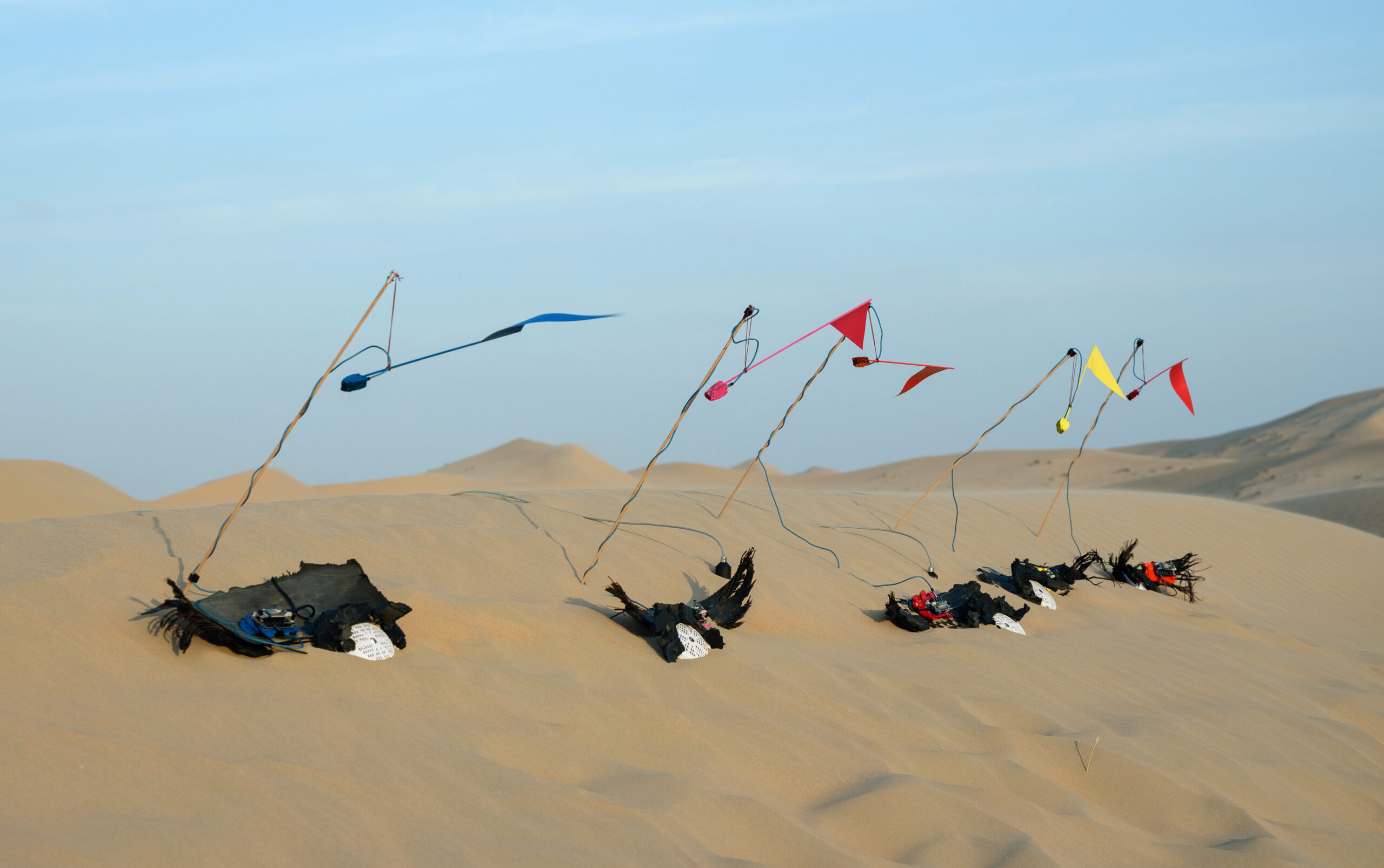 Dunewind Resonator is a set of electronic sound sculptures that transform a sand dune into a musical instrument that responds to the wind. The five wind-activated sculptures that compose Dunewind Resonator were installed at the top of a sand dune in the desert of Abu Dhabi in 2023. The sculptures capture live wind data as they tilt and twirl in the gusts passing over the crest of the dune and generate a musical composition that is amplified into speakers buried in the dune face. The musical composition contains sonic fragments of instruments such as the oud, synthesized sounds designed to stimulate the resonant sub-surface structure of the dune, and human voices.