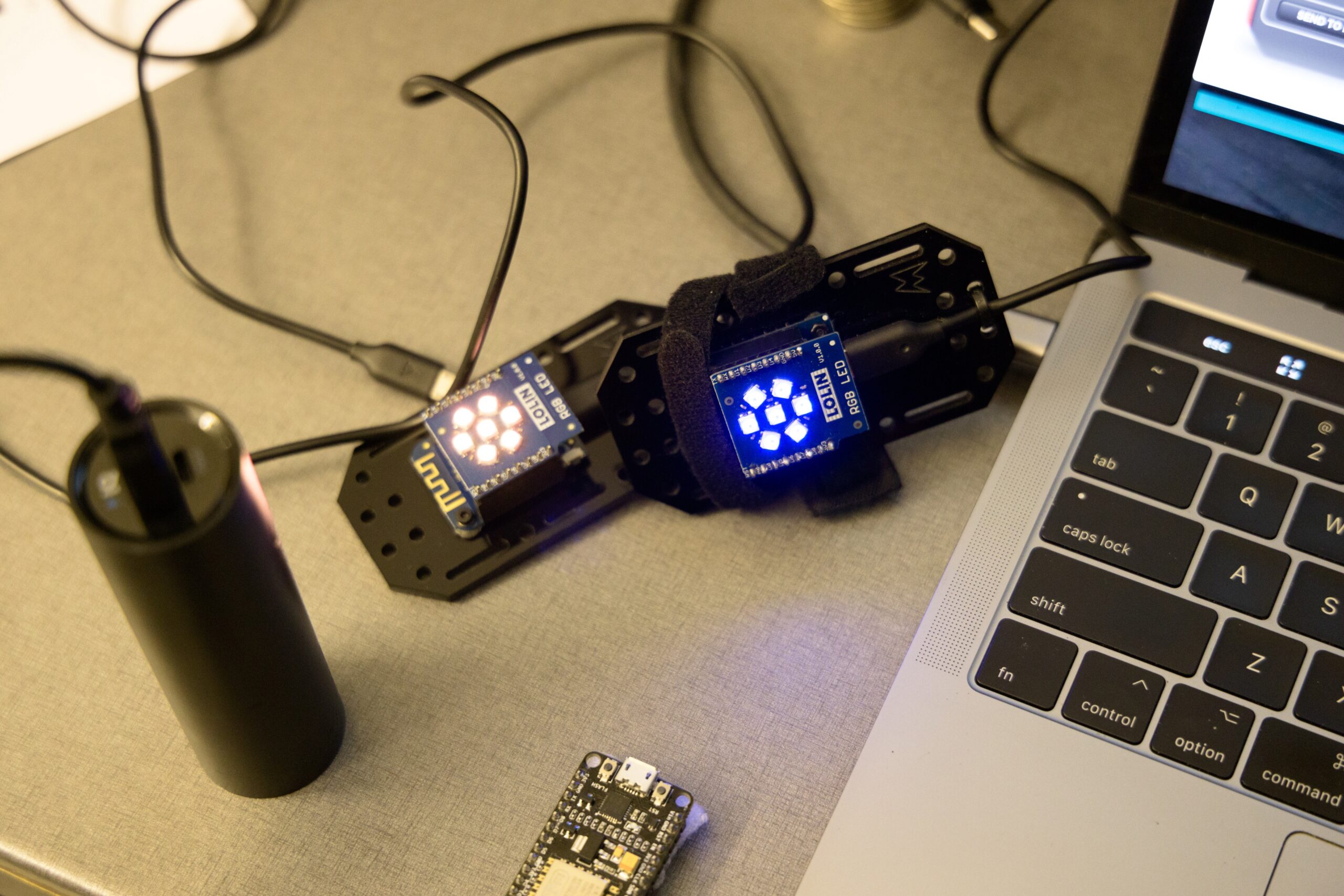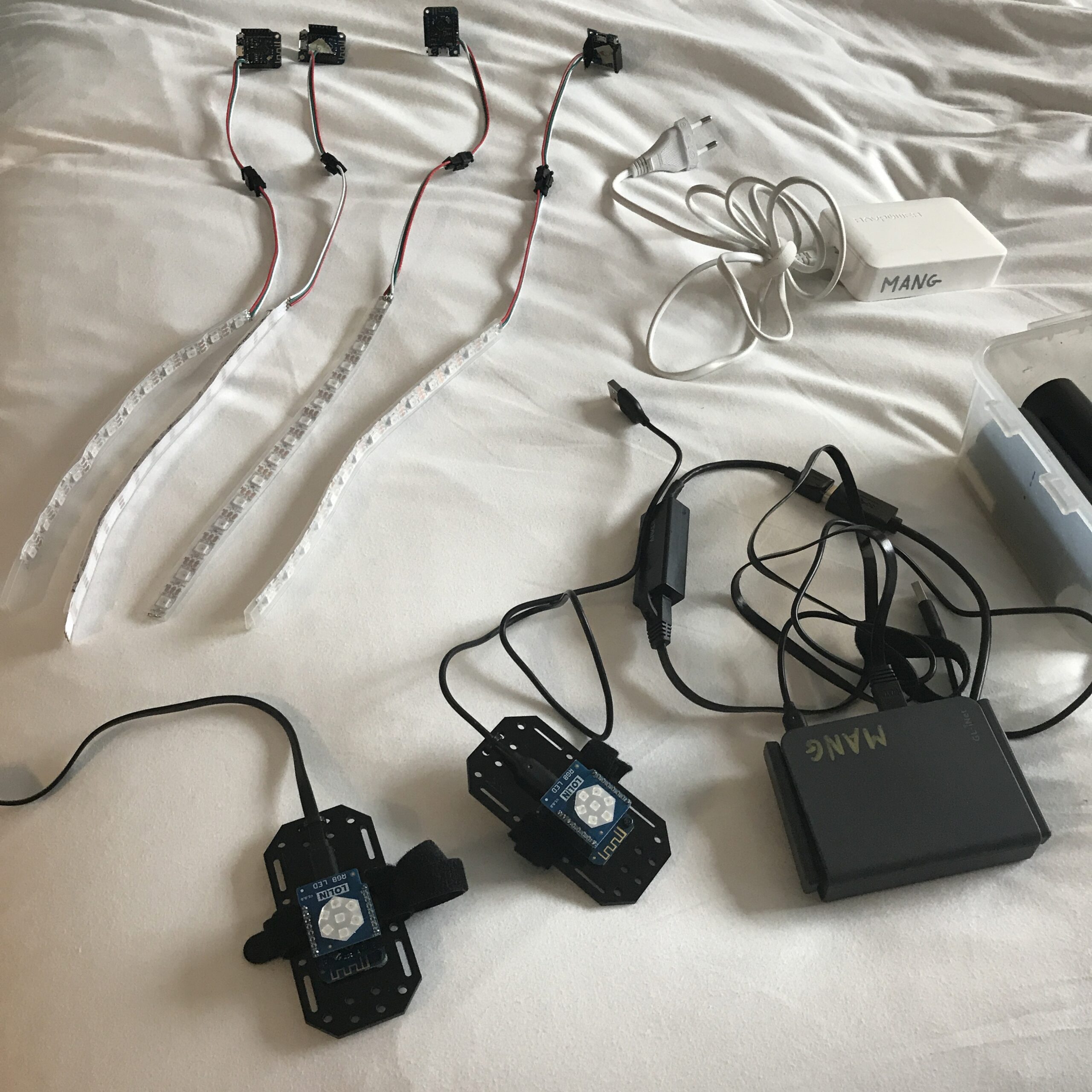 Lux Swarm uses ESP8266 modules running Arduino software using the built-in WiFi Any LEDs using the common WS2811 (NeoPixel) protocol can be used USB battery packs can be used to power the lights, giving a wide range of run time depending on the size of battery and the application. A WiFi access point is used to connect the laptop to to the Lux Swarm nodes. The open source ESPixelStick firmware turns the ESP8266 modules into wireless DMX lighting nodes that can be controlled from most lighting and VJ software.