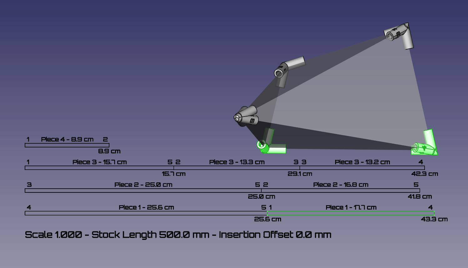 - Creates printable connectors for the vertexes of the polygon and a list of cuts for connecting rods